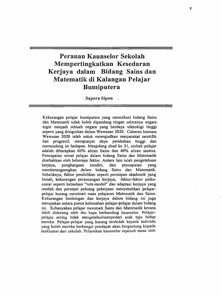 Peranan Kaunselor Sekolah Mempertingkatkan Kesedaran Kerjaya Dalam Bidang Sains Dan Matematik Di Kalangan Pelajar Bumiputera Pdf Pdf